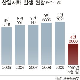 고용노동부에 따르면 2005년 8만5411명이던 국내 산업재해 인원은 2007년 9만147명으로 9만명대를 처음 돌파한 것을 비롯해 꾸준히 증가하고 있다. 올 들어 상반기에만 4만8066건에 이르는 점을 감안하면 92년 이후 18년 만에 10만건을 돌파할 것이라는 우려마저 나오고 있다. 2008년 산재 사망자 1246명을 기준으로 산업재해 원인은 ‘추락’이 408명(32.7%)으로 가장 많았고 이어 충돌·접촉 286명(23.0%), 낙하·비래(날아옴) 106명(8.5%), 협착·감김 96명(7.7%), 화재·폭발 95명(7.6%) 등 순이었다.