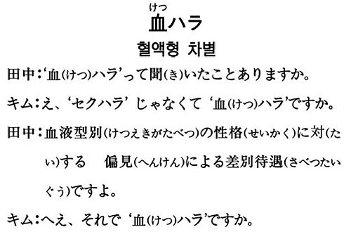 ‘血(けつ)ハラ’는 ‘血液型(けつえきがた)ハラスメント’(혈액형 차별)의 준말이고, 혈액형별 성격에 대해 편견을 갖고 차별대우하는 것을 말한다.
