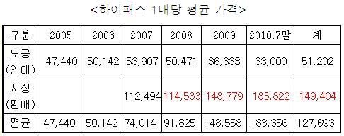 12일 국회 국토해양위원회 김기현 한나라당 의원이 도로공사로부터 제출받은 자료에 따르면, 하이패스 단말기 1대당 평균 가격은 2008년 11만4000원에서 2009년 14만8000원, 2010년 18만3000원으로 올랐다. 도로공사가 단말기 보급을 시장 전환한 2008년에 비해 올해 평균 가격이 무려 60%나 상승한 것이다. 하이패스 단말기 보급대수는 올해 7월말 기준으로 총 437만대를 돌파했으며 판매 금액은 5585억원에 달한다.