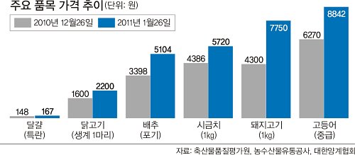 설을 앞두고 물가가 천정부지로 치솟으면서 서민의 시름이 깊어지고 있다. 구제역으로 돼지고기 가격이 사상 최고치를 기록 중인 데다 한파와 폭설로 채소, 과일, 생선 등 모든 품목에서 장바구니 물가가 뜀박질하고 있다. 안정세를 보이던 배추 가격도 들썩이고 있어 ‘2차 배추 대란’이 우려되고 있다.