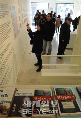 | ◇14일 서울 인사동 가나아트스페이스에서 열린 북한 정치범수용소 전시회를 찾은 시민들이 전시물을 살펴보고 있다. 남제현 기자 |