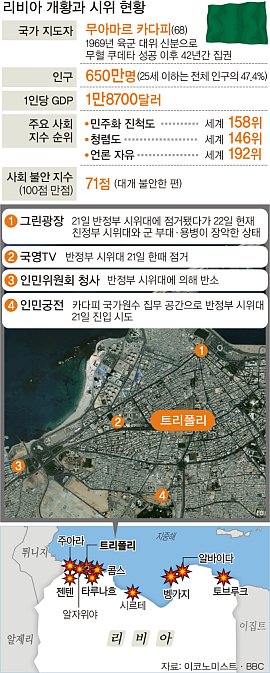 아랍권 방송인 알자지라와 미국 CNN방송 등은 21일(현지시간) 트리폴리에서 전투기와 헬리콥터가 민간인을 공격했다고 보도했다. 스위스에 본부를 둔 ‘진실과 정의를 위한 리비아 위원회’의 파티 알와르파리 대표는 “많은 군 비행기가 트리폴리에서 민간인과 시위 참가자를 공격하고 있다”며 “유엔은 어디에 있고 국제앰네스티는 어디에 있느냐”며 분통을 터뜨렸다.