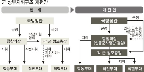 군 소식통은 2일 “국방부가 오늘 비공개로 진행된 한나라당과의 당정협의에서 군 상부지휘구조 개편안을 비롯해 서북도서 전력증강계획, 북한동향 등을 보고하면서 이같이 밝혔다”고 말했다. 이 자리에서 국방부는 합참의장이 합동군사령관직을 겸임하는 쪽으로 방향을 정했으며, 조만간 공론화에 들어갈 것이라는 입장을 전했다고 소식통은 설명했다. 또 국방부는 합참의장이 육·해·공군 작전부대를 지휘하는 현행 상부지휘구조를 각 군 참모총장이 작전부대와 직할부대를 직접 작전 지휘하는 것으로 개편키로 했다. 아울러 각군 본부와 작전사령부를 통합해 각군 참모총장이 사령관의 임무를 병행하게 했다.