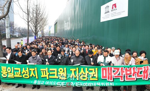 | ◇6일 서울 여의도 파크원 신축공사 현장 앞에서 통일교 여의도 성지 보호 신도비상대책위원회 회원들이 파크원 지상권 매각에 반대하는 촛불집회를 갖고 있다. 이종덕 기자 |