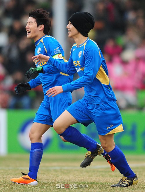 15일 오후 경기도 수원 월드컵경기장 내 보조경기장에서 열린 2011 스타피스컵 연예인 축구대회 FC MEN(가수팀)과 슈퍼스타즈(탤런트팀)의 경기에서 김준수가 골을 넣고 김현중과 환호하고 있다.