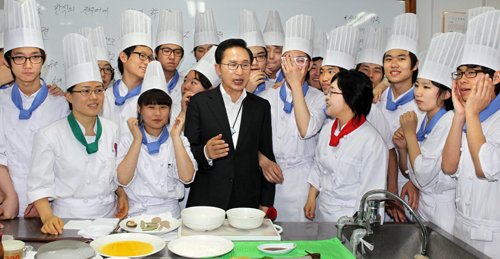 | 이명박 대통령이 19일 서울 관악구 서울산업정보학교에서 국민경제대책회의를 주재한 뒤 조리실습을 하는 학생과 만나 대화하며 격려하고 있다. 연합뉴스 |