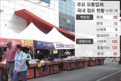 홈플러스 수원 영통점도 점포 밖 일반통로에 대형천막을 설치해 놓고 영업을 했다. ‘신사의류 초특가전’ ‘아동복 균일가전’ ‘나이키·아디다스 행사대전’ 등의 플래카드를 걸어 놓은 임시점포들은 대략 일주일 단위로 영업을 하면서 홈플러스 측에 수수료를 내고 있다. 수수료는 매출의 20%대로 입점업체와 비입점업체 간 큰 차이가 있다고 업체들은 전했다.