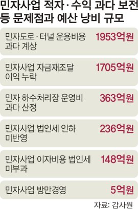 정부가 민간자본으로 지어진 도로·항만 등 사회간접시설(민자사업)의 적자는 물론 최소 이익까지 보전해 주면서 관리·감독을 소홀히 해 혈세가 줄줄 새고 있다.