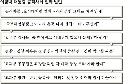 집권 후반기 공정사회·민생 행보를 강화하고 있는 이명박 대통령이 17일 작심한 듯 부조리가 만연한 공직사회에 대오각성을 촉구했다. 이 대통령은 이날 경기 과천시 중앙공무원교육원에서 열린 ‘민생점검 및 공직윤리 확립을 위한 국정토론회’에서 모두 발언을 통해 약 29분간 공직사회에 대한 비난을 쏟아냈다.