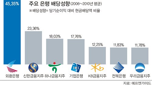 론스타는 지난 1일 중간배당으로 4969억원을 챙겼다. 높은 배당성향(당기순이익 대비 현금배당액 비율) 덕분이다. 3일 금융정보업체 에프엔가이드에 따르면 2006∼10년 외환은행의 평균 배당성향(한국회계기준)은 45.35%. 같은 기간 비교가 가능한 4개 금융지주회사와 2개 은행의 평균 배당성향(15.84%)의 3배에 달한다. 신한금융지주가 23.36%로 외환은행에 이어 그나마 높은 편에 속했고, 나머지는 20%를 넘지 않았다. 특히 2009년에는 당기순이익이 전년 대비 13.94% 증가한 데 비해 배당총액은 308% 늘었다.