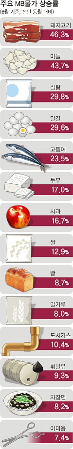 20일 통계청에 따르면 6월 소비자물가는 지난해 같은 달보다 4.4% 상승했다. 이를 잣대로 보면 MB물가품목의 상승률은 ‘괄목’할 만하다. 돼지고기가 46.3%, 마늘 43.7%, 달걀 29.6%, 쌀 12.9% 등으로 농축수산물 상당 품목이 두 자릿수 상승률을 보였다. 공업제품에서도 등유 25.4%, LPG 17.4%, 경유 12.4%, 휘발유 9.3%로 상승폭이 컸다. 내린 품목도 없지는 않다. 배추가 51.2% 하락한 것을 비롯해 파 -40.1%, 무 -35.7%, 양파 -22.9%, 쇠고기 -12.5%, 소주 -2.0%, 이동전화통신료 -1.6%, 교육기관 납입금 -1.2%, 라면 -0.4% 등 9개 품목이 하락했다.