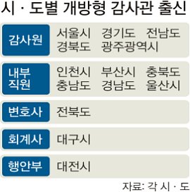 경기 부천시는 개방형 감사관에 회계사를 임명했는데, 시장직 인수위원회 위원을 지낸 인사다. 6개 시·도는 감사관을 내부 직원으로 충원했다. 수도권의 30만명 이상 기초지자체 중 17곳도 소속기관 출신자를 감사관으로 임명했다. 5개 시·도와 수도권 7개 기초지자체 감사관에는 감사원 출신 인사로 충원된 것으로 확인됐다. ‘감사원의 낙하산 인사’에 다름 아니다. 서울 4개 자치구 감사관은 정치인 보좌관 출신으로 채워져 있다.