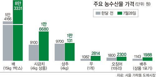 여기에 조기, 오징어 등 수산물도 집중 호우 때문에 바다 조업이 일시 중단되면서 상승 곡선을 그리고 있다. 롯데마트에서는 지난달 1마리에 1800원 하던 국산 냉장오징어가 2300원 안팎으로 올랐다. 조기, 명태 등도 가격이 상승세다.
