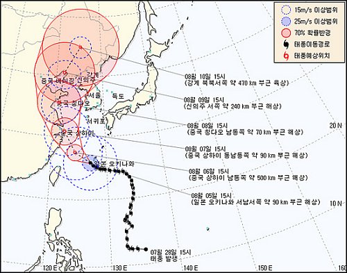 기상청 관계자는 "태풍은 서해 먼바다를 통과해 8일 오후 중국 칭다오 동북쪽 해상으로 이동할 예정"이라며 "강한 바람과 함께 많은 비를 뿌릴 것으로 예상되니 피해에 대비할 것"을 당부했다.