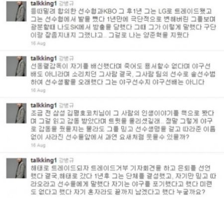 이어 "선동렬 감독이 자기를 배신했다며 죽어도 용서할 수 없다며 야구선배도 아니라며 소리치던 그 사람 결국, 그 사람 팀의 선수로 솔선수범해 선수생활을 오래했다. 그는 야구선수지 야구 선배는 아니다"고 강도 높은 비난을 퍼부었다.