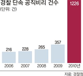 21일 경찰청이 국회 행정안전위 안효대 의원(한나라당)에게 제출한 자료에 따르면 경찰이 단속한 공직비리 건수는 2006년 216건에서 지난해 1226건으로 5.7배가 됐다. 연도별로는 2007년 228건, 2008년 265건, 2009년 357건 등으로 해마다 증가하고 있다.