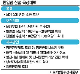 정부는 이를 위해 올해 108억원을 비롯해 내년 126억원, 2013년 181억원 등 향후 5년간 843억원을 투·융자해 현재 1400억원 수준인 천일염 생산액을 2015년까지 2636억원 규모로 늘리고, 수출도 110만 달러에서 300만 달러로 확대하기로 했다.
