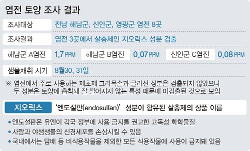 해당 염전 천일염 출하 금지… 추가 정밀조사 일부 염전에서 함초 등을 죽이기 위해 농약을 친다는 세계일보 보도〈8월16일자 1·3면 참조〉와 관련, 정부의 염전 토양 조사결과 비식용 작물 외에 사용이 금지된 살충제 지오릭스의 엔도설판 성분이 검출됐다. 살충제를 뿌린 날의 바닷물로 만든 소금에도 농약성분이 들어갔을 가능성을 배제할 수 없어 파장이 클 것으로 보인다.