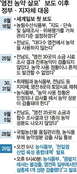 농식품부가 ‘염전 둑’ 농약 검출 사실을 공개한 시각은 전날 오후 6시40분. 일과가 모두 끝난 때다. 우리 천일염을 세계 3대 명품으로 발돋움시키겠다는 장밋빛 정책은 오전에 발표됐다. 맛칼럼니스트 황교익씨는 이에 대해 ‘꼼수’라며 비난했다.