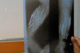 | 인도네시아 의사가 양쪽 종아리 속에 대못이 25개나 들어 있는 사피라(3)양의 X-선 사진을 들고 있다. /안타라통신 제공 |
