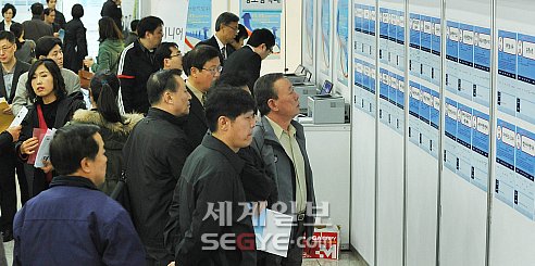 일자리 찾는 중년들 17일 오후 서울 마포구청 1층 로비에서 열린 ‘인생 2막을 설계하는 중장년층을 위한 4050 채용박람회’에 참가한 구직자들이 채용게시판을 살펴보고 있다. |