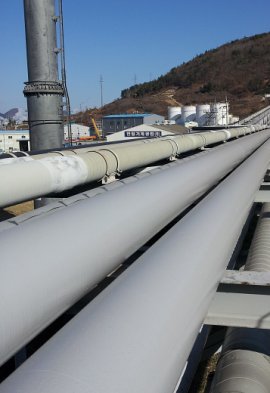 | 전남 광양∼여수를 잇는 이순신대교의 접속도로 건설 공사가 진행 중인 현장에 GS칼텍스의 원료 이송관로 다발(파이프랙)이 육교 모양으로 버티고 서 있다. 도로를 따라 지하에 편법으로 묻힌 관로를 옮기는 데에도 100억원에 이르는 국고가 낭비됐다는 지적을 받고 있다. 특별기획취재팀 |