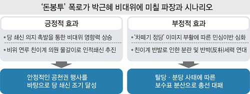 ‘돈 전대’ 사건은 우선 쇄신 극대화 계기가 될 수 있다. 비대위가 구당(救黨)을 명분으로 쇄신 동력을 한껏 끌어올릴 것이란 전망에는 이견이 없어 보인다. 수도권의 한 의원은 6일 “돈봉투 사건이 당 쇄신의 동력이 될 것이 분명하다”고 강조했다. 그러면서 “친이(친이명박)계인 고 의원의 폭로로 사건이 촉발됐다는 것도 주목해야 한다”는 의미심장한 말을 던졌다. 이로 인해 가장 큰 타격을 받을 친이계의 당내 존립 기반이 더욱 약화하면서 자연스럽게 물갈이론이 확대될 것이란 얘기다.