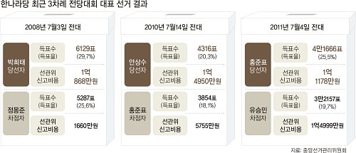 그렇더라도 검찰은 수사 대상을 박 의장이 대표로 뽑힌 2008년 전대에 국한하진 않을 방침인 것으로 전해졌다. 안 전 대표가 등극한 2010년 전대는 물론 경우에 따라서는 지난해 전대도 수사 대상이 될 수 있다는 게 검찰 판단이다. 정치권 관계자는 “세 차례 전대 때 모두 돈봉투가 오갔다”고 말했다. 검찰 관계자는 “야당이라고 뭐가 얼마나 다르겠느냐”는 말로 심지어 민주통합당도 수사선상에 오를 수 있음을 내비쳤다.
