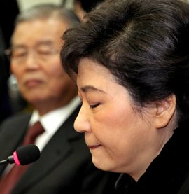 | 한나라당 박근혜 비상대책위원장이 9일 국회에서 열린 비대위 회의에서 입술을 굳게 다문채 굳은 표정을 짓고 있다. 박 위원장은 이날 회의에서 ‘전당대회 돈봉투’ 파문과 관련해 구태정치 단절에 대한 강한 의지를 밝혔다. 연합뉴스 |