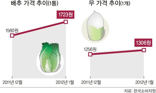 배추와 무 값은 지난해 추석 이후 양호한 기상 여건, 출하 확대에 힘입어 폭락이 우려될 정도로 하락을 거듭했으나 올해는 공급 물량 감소 등으로 역전됐다. 가을 배추 값 폭락으로 농민들이 봄 배추 재배를 줄인 데다 한파까지 겹쳐 가격이 급등한 것으로 추정된다. 농림수산식품부는 물가에 영향을 미칠 정도로 생산량 감소가 예상되면 수입량을 확대한다는 계획이다. 그러나 최대 수입처인 중국 또한 한파로 채소 값이 급등해 실효를 거두지 못할 것으로 우려된다.