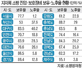 소방방재청 관계자는 “최근 국회에서 노후 소방장비 일부를 보강할 예산 402억원을 책정하려다 기획재정부가 ‘지자체 예산으로 할 일’이라며 반대해 무산됐다. 소방 장비 확충·교체는 단체장이 의지를 가지고 허리 띠를 졸라매 추진해야 한다”고 말했다.