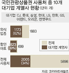 국민관광상품권 인기에 힘입어 상품권을 받는 가맹점의 수익도 늘고 있으나, 소상공인은 소외된 처지다. 가맹점이 대기업 계열사 일색인 탓이다. 15일 코리아트래블즈에 따르면 국민관광상품권의 전체 가맹점 5898개 가운데 2034개가 대기업 소속이다. 상품권을 사용할 수 있는 가맹점 중 34.5%를 CJ, 롯데, 삼성, 이랜드, 현대, LG, 한화, GS, 오리온, 썬앳푸드 등 대기업 10곳이 차지한 것이다.