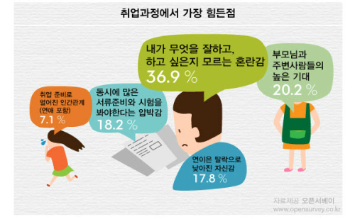 취업 준비생들의 구직 과정에서 가장 힘든 것은 스트레스나 자신감의 하락보다도 ‘무엇을 잘하고, 하고 싶은지 모르는 혼란감’ 이라는 응답이 36.6%로 가장 많았다. 이어서 부모님과 주변사람들의 높은 기대가 20.2%, 동시에 많은 서류준비와 시험을 봐야 한다는 압박감이 18.2%, 연이은 탈락으로 낮아진 자신감 17.8% 순으로 나타났다.