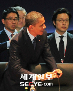 | 버락 오바마 미국 대통령이 27일 서울 강남구 코엑스에서 열린 서울 핵안보정상회의에서 손으로 마이크를 가리며 인사를 하고 있다. 남제현 기자 |