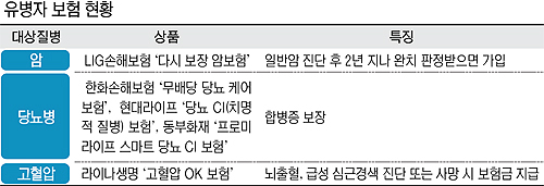 1년 이상 가입한 뒤 중도 인출을 요청하면 당시 적립 해지환급금의 80% 한도로 돌려준다. 연 12회까지 중도인출을 할 수 있다. 가입자에게는 3개월분 혈당 검사지와 혈당측정기를 무료로 제공한다. 만기는 60세, 70세, 80세로 구분된다. 보험료 납입기간은 5년부터 5년 단위로 30년까지 택할 수 있다. 말기 신부전증 진단비는 갱신형, 비갱신형 중 선택할 수 있다. 이밖에 유병자 보험으로는 현대라이프의 ‘당뇨 CI(치명적 질병) 보험’, 라이나생명의 ‘고혈압 OK 보험’, 동부화재의 ‘프로미라이프 스마트 당뇨 CI 보험’ 등이 있다.