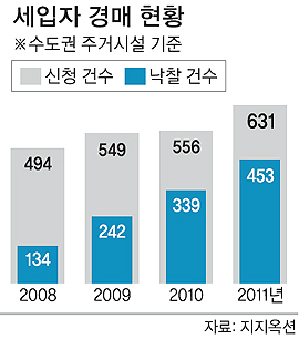 특히 세입자가 전셋집을 직접 낙찰받은 사례는 지난해 453건으로 2010년 339건보다 33.6%나 늘었다. 지역별로는 서울이 2010년 53건에서 지난해 95건으로 80% 늘었고, 인천과 경기도도 각각 82건에서 123건, 204건에서 235건으로 증가했다. 최근 집값 하락으로 전셋값과의 격차가 좁혀진 데다 경매시장에서 저가 낙찰을 통해 내 집을 마련하겠다는 심리가 확산한 때문으로 보인다.