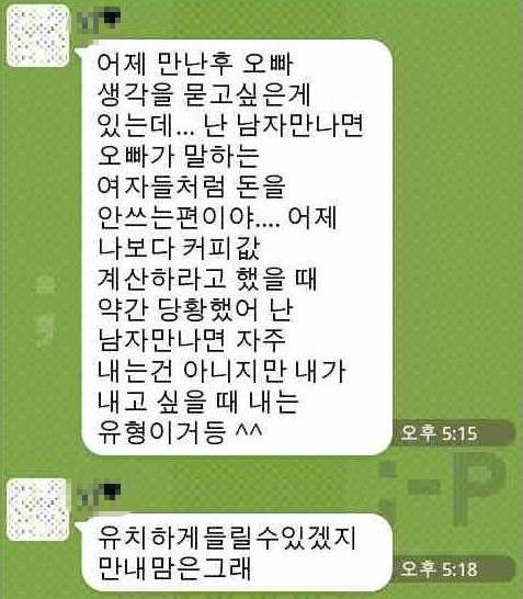 카톡에서 여성은 ‘난 남자 만나면 돈을 안 쓰는 편이야… 어제 나보고 커피값 계산하라고 했을 때 약간 당황했어’ ‘친구들도 내가 커피값 냈다니까 다들 어이없어 하더라’ 등의 메시지로 서운한 감정을 표현한다.