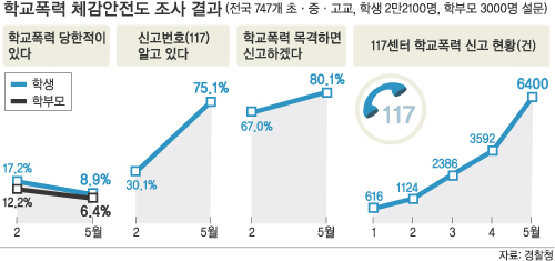 신고번호(117)에 대한 인지도(30.1→75.1%)와 신고의향(67.0→80.1%)도 크게 늘었다. 조사는 지난달 9∼21일 전국 747개교 학생 2만2100명과 학부모 3000명을 상대로 실시됐다.