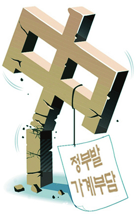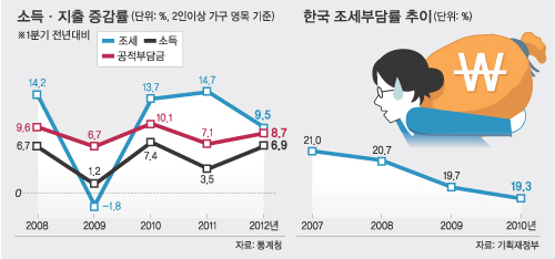 정부발 가계부담 증가는 앞으로 더 심화될 공산이 크다. 우리나라의 조세 부담은 현 정부 출범 전인 2007년 21.0%에서 2010년 19.3%로 계속 낮아졌다. 경제성장과 감세의 영향이 큰 것으로 판단된다. 조세부담률은 가계 외에 기업 납세액과 소비세 등 국가 전체 세금을 국내총생산(GDP)으로 나눈 것이다.
