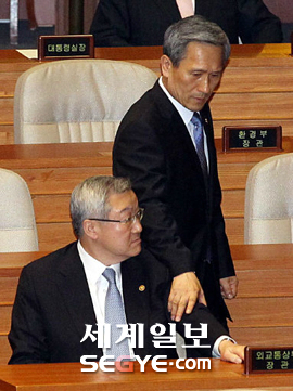 2일 19대 국회 개원식에 참석한 김관진 국방장관(오른쪽)이 김성환 외교통상부 장관의 팔을 짚으며 무언의 위로를 건네고 있다. 두 장관은 ‘밀실 처리’ 논란에 휩싸인 한·일 군사정보보호협정 관련 부처 수장들이다. 이제원 기자 |