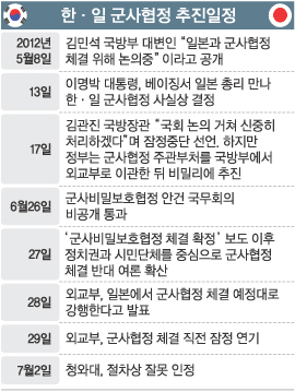 협정을 밀어붙인 이면에는 상반기를 넘기면 7∼8월 일본 방위백서가 발표되고, 8월에는 광복절로 국민감정이 악화한다는 점을 고려한 측면이 있어 보인다. 8월부터 사실상 대선 국면에 돌입하는 정치 일정도 감안한 듯하다. 이 대통령과 노다 요시히코(野田佳彦) 일본 총리는 이와 관련해 5월13일 중국 베이징에서 열린 양국 정상회담에서 협정 체결의 교감을 이룬 것으로 알려졌다. 군 소식통은 “정상회담을 가진 뒤 국방부가 실무 차원에서 협정체결 작업에 뛰어들었다”며 “불발되긴 했으나 한·일 정상 간 협의를 지원하기 위한 장관급 회담이 추진된 것도 이 무렵”이라고 말했다. 그는 “당시 국방부 한 간부가 김 국방장관에게 독도와 일본군 위안부 처리 문제 등 양국 간 관계가 껄끄러운 상태에서 서둘러 군사협정을 체결하는 것이 적절치 않다는 뜻을 전달했으나 받아들여지지 않았다”고 전했다.