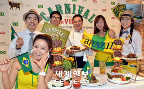 4일 서울 중구 쌍림동 CJ제일제당 빕스 푸드월드점에서 모델들이 브라질 농부들이 즐겨 먹던 ‘슈하스쿠(여러 종류의 고기를 꼬치에 끼워 숯불에 구워먹는 요리)’를 모티브로 한 ‘브라질리언 삼바 스테이크’ 등 새로운 메뉴를 선보이고 있다. 남제현 기자 Copyright ⓒ 세계일보. 무단 전재 및 재배포 금지
