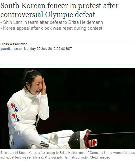 가디언 인터넷판은 신아람이 어이없는 판정 이후 경기장을 빠져나가지 않고 오열하는 장면을 실었다.
