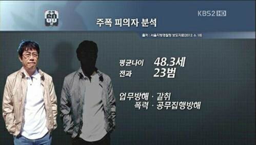 KBS 2TV ‘추적 60분’ 방송화면을 캡쳐한 것으로, 당시 ‘주폭(酒暴)’ 문제를 다룬 화면에 이경규의 사진이 등장했다. 제작진은 이경규의 얼굴만 지운 채 몸 사진과 함께 ‘나이 48.3세, 전과 23범’이라는 설명을 달았다.
