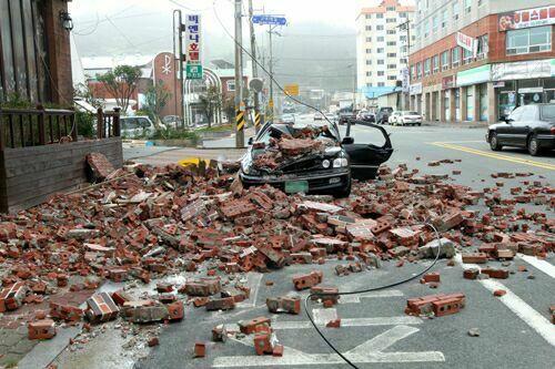 | 차량 덮친 벽돌 역대 5위권 위력인 초속 50m의 안팎의 강풍을 동반한 볼라벤이 북상하는 가운데 28일 오전 전남 완도군 완도읍의 도로에서 건물 외벽 벽돌이 강풍에 쓰러져 주차된 차량을 덮쳤다. <연합> |