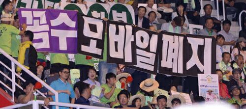 | 민주통합당 18대 대통령 후보자 선출을 위해 16일 경기도 고양시 고양체육관에서 열린 서울 경선장에서 한 후보 측 지지자들이 불공정 논란을 낳은 모바일투표를 비판하는 펼침막을 들어보이고 있다. 허정호 기자 |