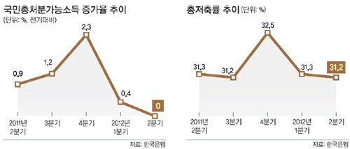 전기 대비 증가율은 지난해 2분기 0.9%에서 3분기 1.2%, 4분기 2.3%로 상승하다 올 들어 가파른 내리막길을 달렸다. 올 1분기 0.4%로 둔화되더니 2분기엔 증가율이 멈췄다. 소득 정체 여파로 저축 사정도 악화되고 있다. 올 2분기 총저축률은 31.2%로 전기보다 0.1%포인트 떨어졌다. 작년 4분기 32.5%까지 높아진 뒤 계속 하락하고 있다.