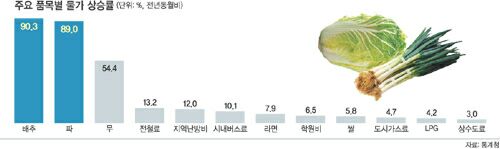 우리나라의 물가가 사상 최저 수준의 안정을 유지하는 것과는 달리 서민 생활과 밀접한 품목은 뜀박질하고 있다. 김장철을 맞아 배추는 전년 동월보다 90.3%나 올랐다. 파(89.0%), 무(54.4%) 등 김장 관련 품목도 덩달아 뛰었다. 소비자물가 조사대상 481개 품목 중에서 배추, 파, 무가 나란히 상승률 1, 2, 3위를 기록했다. 가장 필요한 시기에 해당 품목이 폭등한 것이다. 주식인 쌀이 5.8%, 라면은 7.9% 올랐다. 상승률이 소비자물가보다 4∼5배가량 높다. 학원비(6.5%) 같은 사교육비마저 크게 올라 서민 가계의 부담을 키웠다.