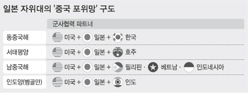 미국은 수년 전부터 자위대를 끌어들여 서남아시아(미·일인도), 남중국해(미·일베트남· 필리핀·인도네시아), 서태평양(미·일호주), 동중국해(미·일한국) 등 미·일 동맹을 기축으로 해당 지역 국가를 끼워넣는 형태의 중국 포위망을 추진해왔다.