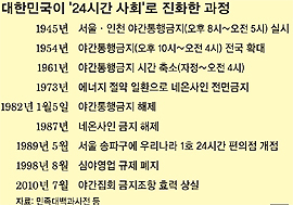 한국에서 ‘24시간 사회’가 본격화한 것은 2000년대 이후부터다. 1980년대 중반 ‘24시간 편의점’이 들어서면서 그 시작을 알렸고, 1990년대를 거치며 대학생과 젊은이들을 중심으로 심야 쇼핑족, 나이트족이 폭발적으로 증가했다.